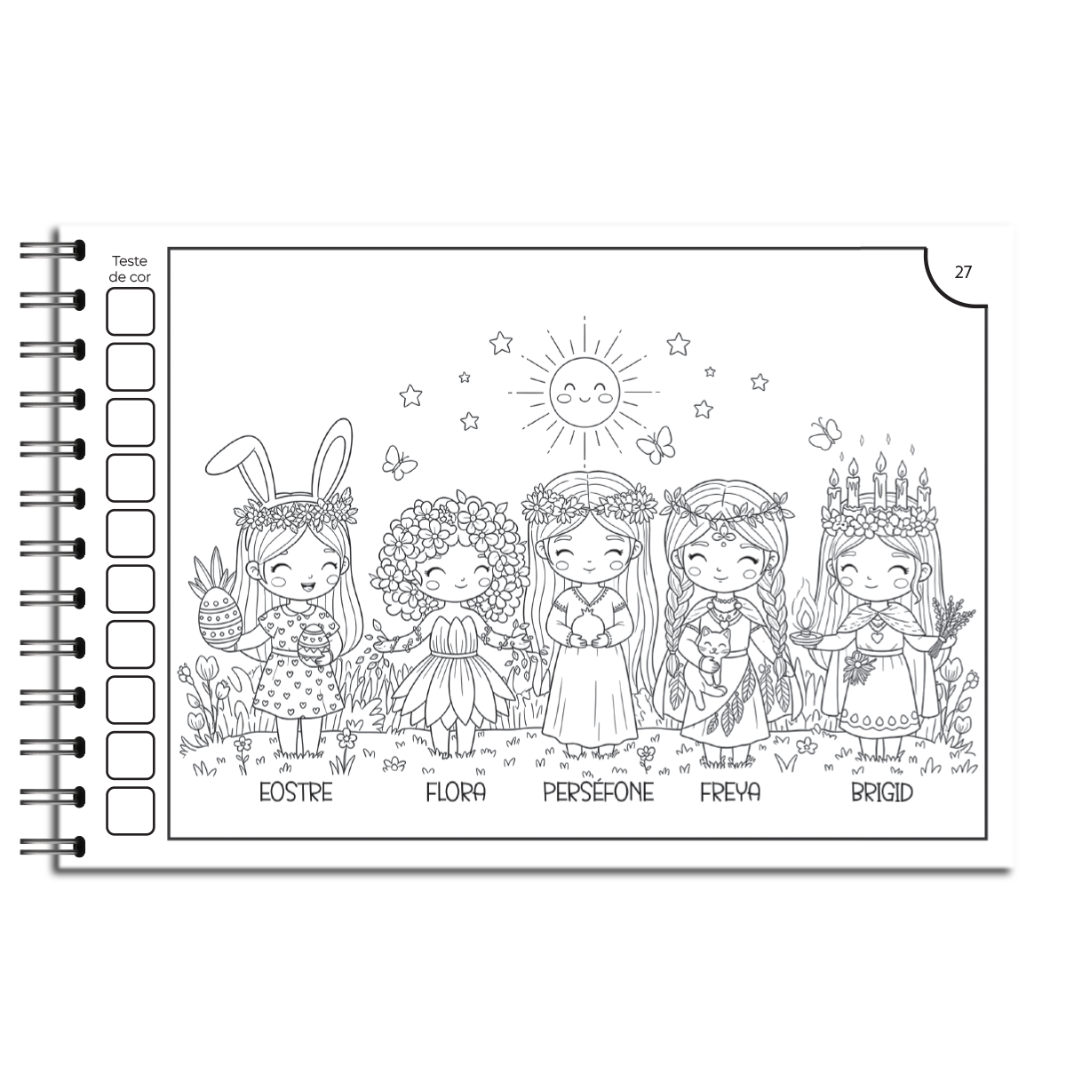 “A Magia das Estações” é muito mais do que um simples livro de colorir. É um verdadeiro portal ilustrado, onde as crianças podem colorir, imaginar e se conectar com a natureza, com os ciclos da vida e com a magia que existe em cada estação do ano. As páginas trazem representações das deusas Eostre, Flora, Perséfone, Freya e Brigid, além de ervas, incensos, gatos, pequenos magos, poções, chás e muito mais.