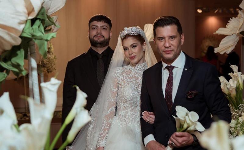 A noiva, Giovanna Alves, estava deslumbrante em um vestido Rosa Clará, selecionado pela Casamarela. O modelo, de corte sereia e decote em coração, combinava tule de poás, rendas aplicadas à mão e delicadas pedrarias, criando um visual que unia romantismo e modernidade. A beleza foi assinada por Felipe Caxito, que apostou em uma produção luminosa e natural, valorizando a suavidade e a elegância da noiva em sua entrada triunfal ao som da Clarinada da Rainha da Inglaterra e da tradicional Marcha Nupcial.