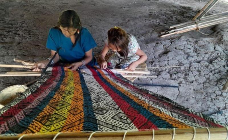 (Na Escola Viva Huni Kuï, os jovens aprendem a tecelagem em meio às outras aprendizagens. Foto: divulgação)